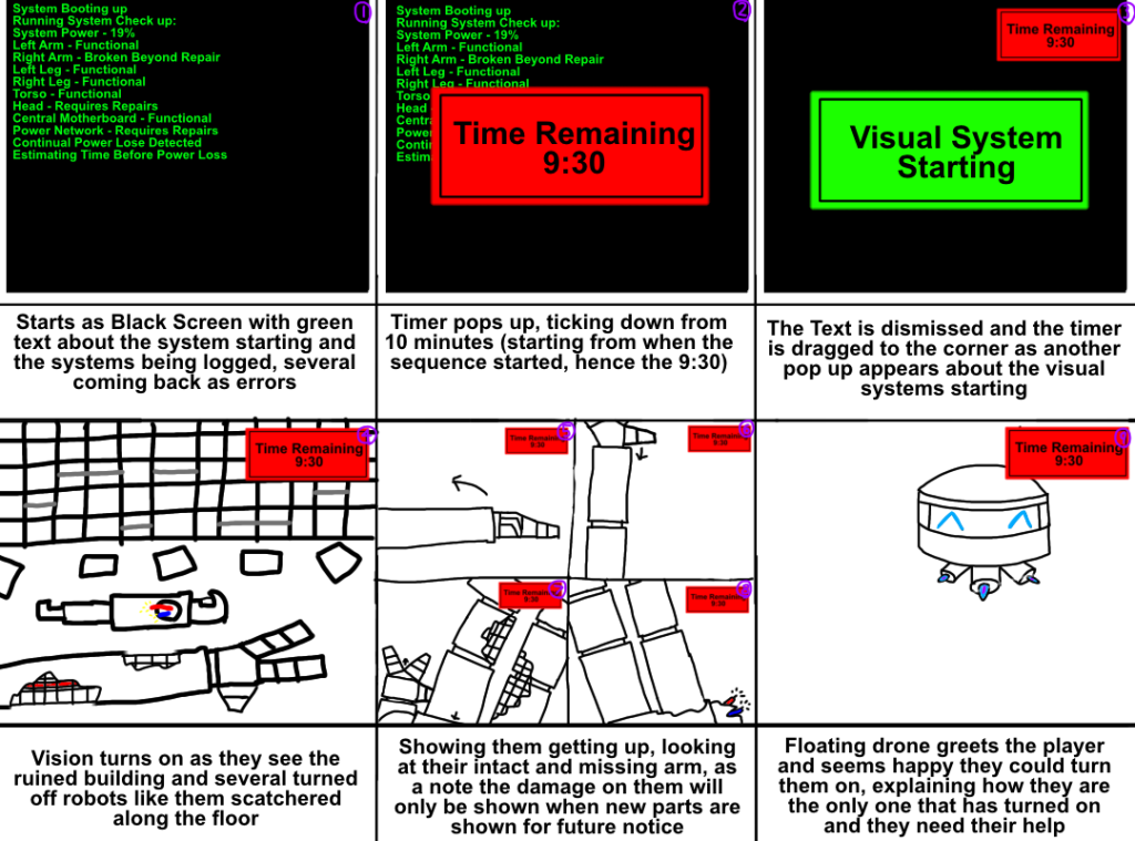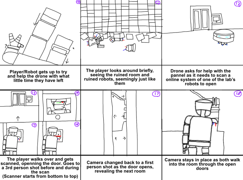 - It then changes to show the player looking around the ruined room filled with ruined robots (10 seconds)