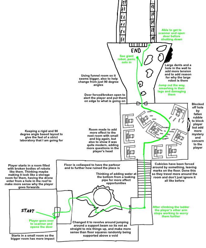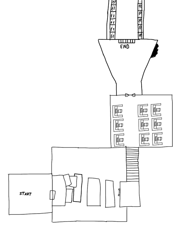 This first one was the most basic, it needed to go, at this point I was just starting out, so the concepts are there, but once I started learning level design principles I knew it had to be changed.
