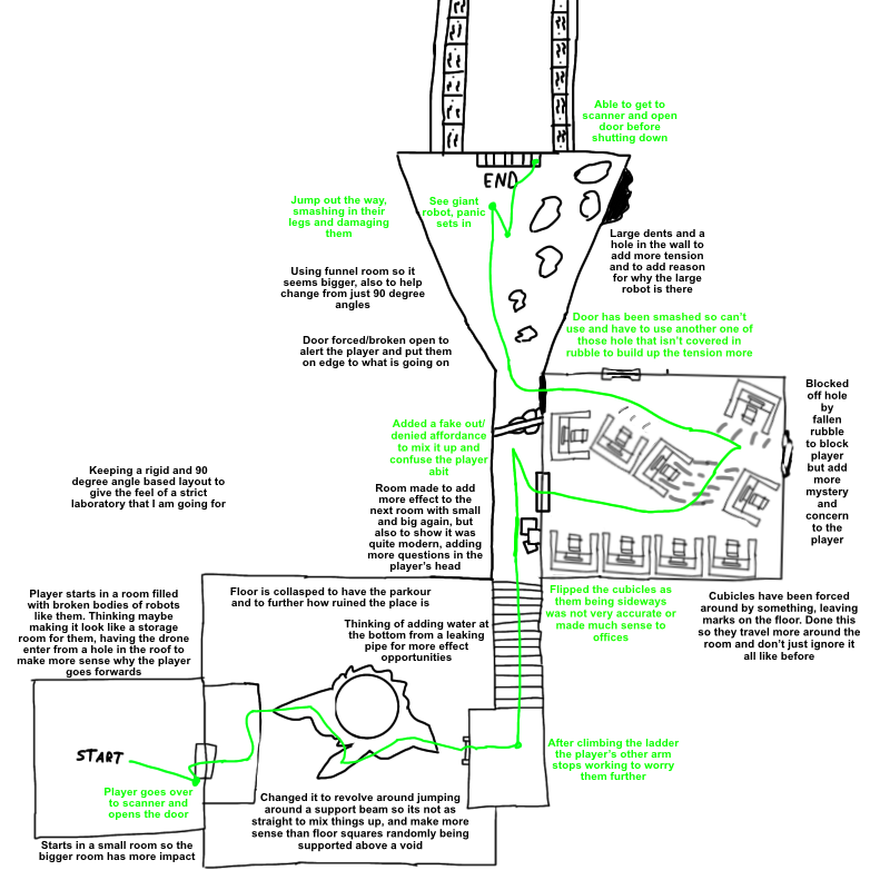 This final one didn’t change much, but I learned more about blueprints and realized stairs don’t tend to go into offices, so I made a hallway that gets blocked as they go down it, denying affordance and motivating them more by basically dangling the goal in front of them.