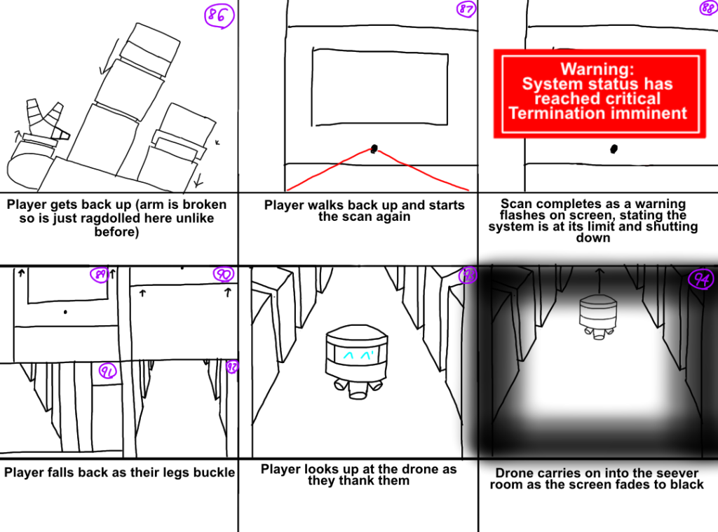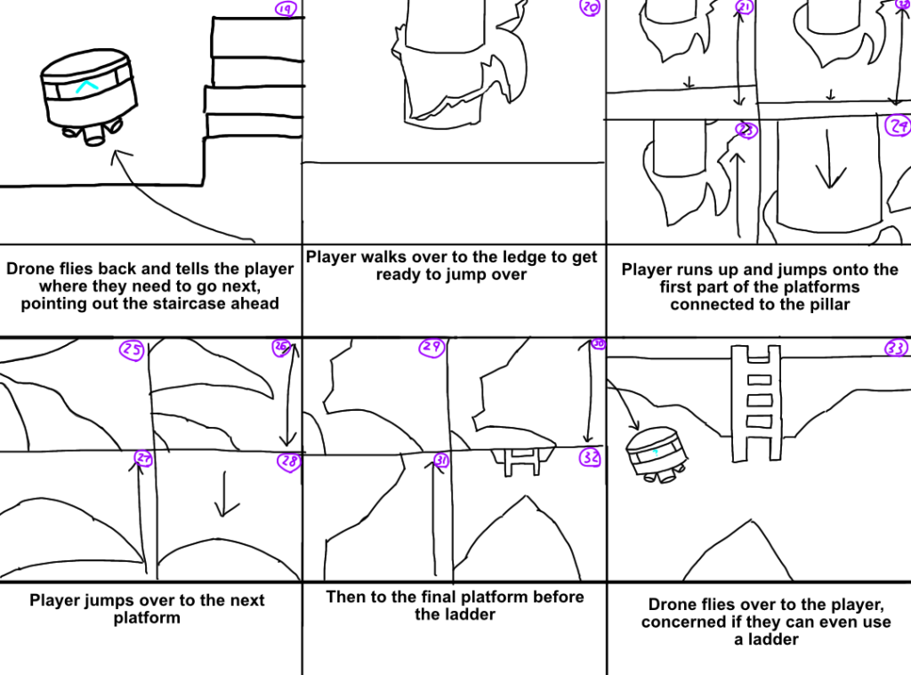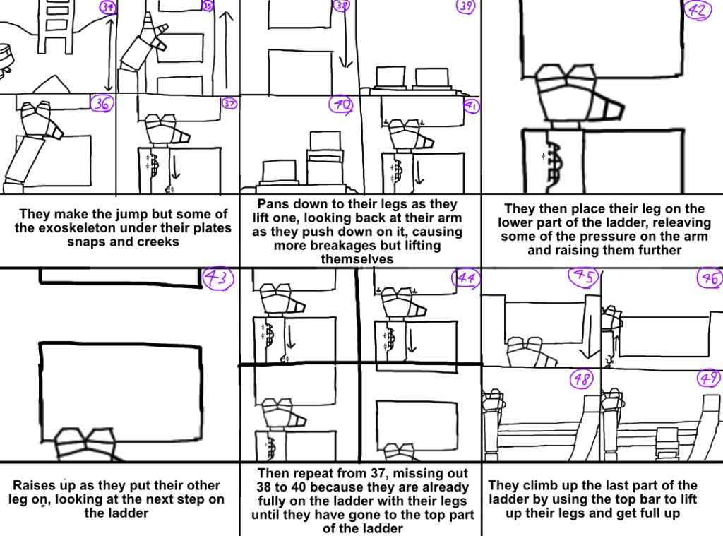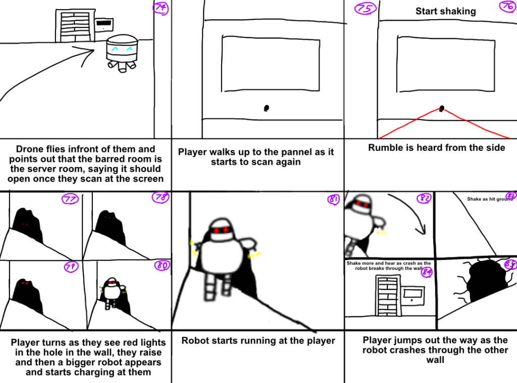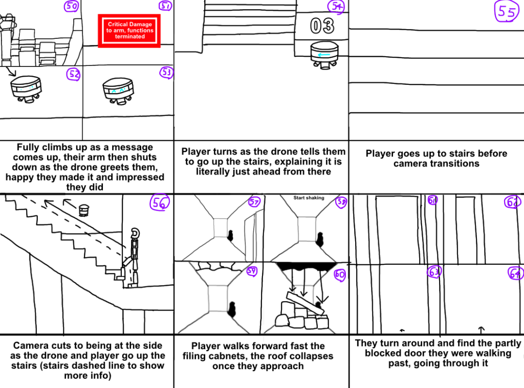 These share scenes with my level design sequence due to them being in the same level, explaining the high amount. It definitely helped making this as it worked as a reference I would return to each time I was lost for what to do next in the sequence. The reason why I have some blocks split into 4 is to save room on if the scene is simple description vise, such as standing up, but needs several scenes to get what I want across.