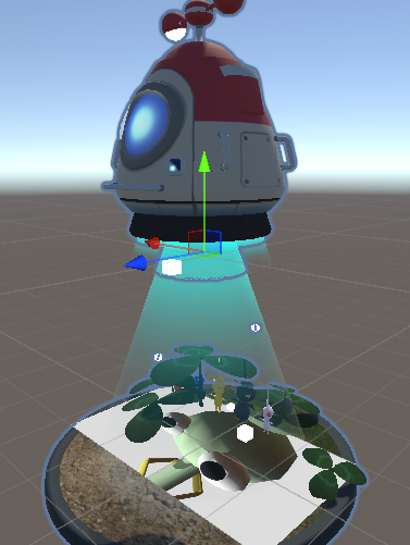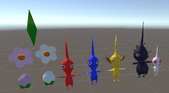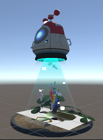 I decided to make a scene about the pikmin around the ship, a small tower keeping a white pikmin balanced on a clover and a tower trying to save another being stolen by the ship. I made sure they all had different tops to help them stick out from each other, grouping the assets together helped, it also helped that the ship was also made of different assets, allowing me to move the clover for this effect.